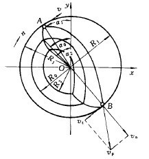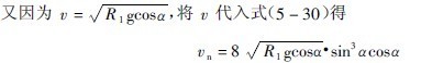 鋼球落到落回點B時,其速度vp可分解為從磨機中心到落回點B方向的法向分速度vn及與筒體圓周相切的切向速度v1。法向速度vn用于沖擊礦塊,切向速度v1沿筒壁切線方向?qū)ΦV塊或礦粒產(chǎn)生磨剝作用。這里主要考慮鋼球?qū)ΦV塊的沖擊作用,故未考慮v1。根據(jù)戴維斯及列文松等人的理論,vn為: