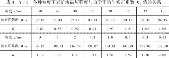 (1)巖石力學(xué)性質(zhì)的不均勻性修正。粗礦塊內(nèi)部宏觀和微觀裂紋多,故強(qiáng)度低。而當(dāng)?shù)V塊變細(xì)后各種裂紋逐漸消失,強(qiáng)度逐漸增大。原蘇聯(lián)學(xué)者曾對(duì)不同粒度的礦塊作過(guò)破壞強(qiáng)度測(cè)定研究。但當(dāng)?shù)V粒度小于1mm時(shí)尚未見(jiàn)到測(cè)定資料。芬蘭胡基教授曾作過(guò)不同粒度下的磨碎功耗測(cè)定,結(jié)果說(shuō)明粒度變細(xì)與功耗的增加不是直線的比例關(guān)系。而呈類似冪函數(shù)的曲線關(guān)系增長(zhǎng),表明細(xì)磨時(shí)功耗增加比粒度變小快得多。參照胡基的研究和筆者進(jìn)行的細(xì)磨研究,在表3-5-4, 中補(bǔ)充了1mm以下的破壞力數(shù)值和修正系數(shù)。