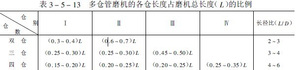 管磨機(jī)用于開流(路)系統(tǒng)時(shí),選取較大的長(zhǎng)徑比,一般L=(3.5-6.0)D;用作閉流(路)系統(tǒng)時(shí),選用較小的長(zhǎng)徑比,一般L=(3.5-6.0)D。多倉管磨機(jī)各倉(室)的長(zhǎng)度按實(shí)際情況確定。但在許多情況下,磨機(jī)后的一個(gè)倉室(細(xì)磨倉)的長(zhǎng)度長(zhǎng),各倉(室)占筒體有效長(zhǎng)度的百分?jǐn)?shù),如表3-5-13所示。