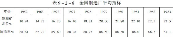 (2)國內(nèi)銅選礦現(xiàn)狀我國現(xiàn)有32座大中型銅選廠,年產(chǎn)方噸以上精礦含銅量的有銅錄山、德興、白銀、易門、落雪等選廠。口處理量在3000噸以上的有13座,500-3000噸的有15座。礦石入選品位平均為0.94%,雖然原礦品位逐年下降,但銅精礦品位則隨著選礦工藝的發(fā)展和技術(shù)進步而逐年提高,如表9-2-8所列。