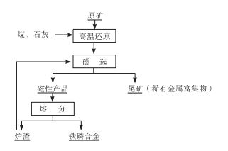 根據礦樣的化學成分特點,本選礦試驗擬采用下圖所示的“高溫還原-磁選分離-熔分”工藝,探索從高鐵磷復雜稀有金屬礦中回收鐵磷合金的可行性。先將礦樣與還原劑活性碳等助劑混勻,放入石墨坩堝,置于高溫爐中,然后在設定溫度和時間下還原,冷卻后將爐料用顎式破碎機破碎,再采用弱磁選機將鐵磷從礦石中分離出來,將弱磁產品進行高溫熔分,回收鐵磷合金,以達到富集稀有金屬的目的。