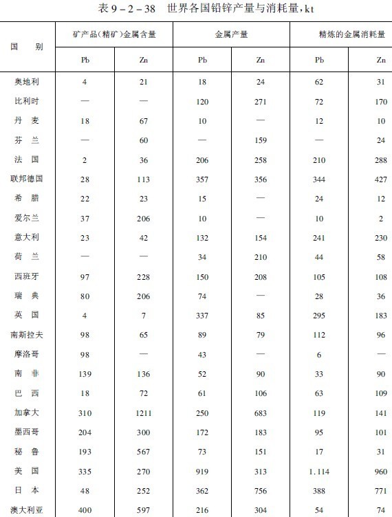 隨著科學的進步和工業生產的發展,世界各國對鉛鋅的需求量每年雖有起伏,但總的趨勢是不斷增加,因而促進了鉛鋅礦冶工業的發展。1984年27個國家的鉛鋅礦產品(精礦)金屬含量,金屬產量,精煉的金屬消耗量列于表9-2-38。