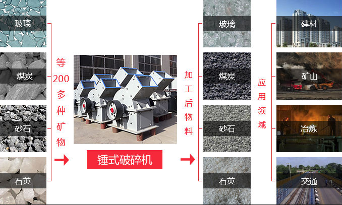 在實際生活中,人們常用小錘破來加工石灰石、花崗巖、鐵礦石、玻璃和大理石等物料的破碎,其成品也被廣泛應用于建材、冶煉、道路、建筑、交通等諸多行業領域中。