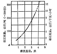 礫介的消耗與礫的物理性質、機械性質、礫介的粒度、磨礦濃度、磨機的直徑、襯板的結構及磨機的轉速率等有密切的關系。抗磨性和沖擊強度差的礦石,自然會使礫介的消耗量大,并在一定的情況下,可能使第二段礫磨成為不可能。礫介的粒級愈粗,礫介的消耗量愈大。如某礦第一段礫磨機的礫介粒度為80-250毫米時,礫介的消耗量為47公斤/千瓦時;而在第二段礫磨機的礫介粒度為40-80毫米時,礫石耗量為17公斤/千瓦時。磨礦濃度愈低,礫介間的接觸愈多,礫介磨損也愈快。尤其值得注意的是,礫介的消耗隨磨機直徑的加大而迅速增加,如圖3-3-16所示,礫石耗量是磨機直徑的函數,當磨機直徑增加50%時,礫石的消耗量加倍。此外,礫介的消耗量隨磨機轉速率的增加而增加。提升襯板越高,礫介耗量也越大。如有一硫化礦的第二礫磨,裝有80毫米高的新橡膠提升板,與低波紋形剖面已磨損的襯板相比,前者的礫石耗量為后者的兩倍。