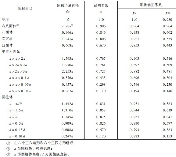 表3-4-4 規則形狀顆粒的球形系數和形狀修正系數