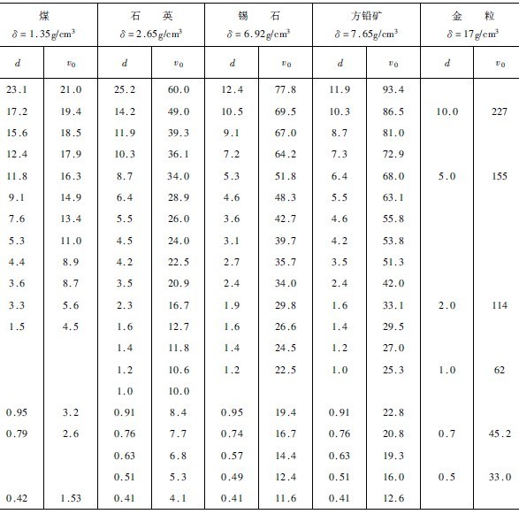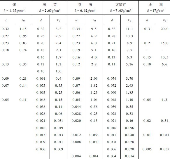 表3-4-6 礦粒在水中自由沉降的平均末速度( d—礦粒的粒度,mm,vo—沉降平均末速度,cm/s)