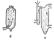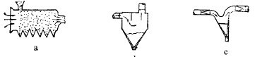 圖3-4-5示出幾種簡單的有代表性的重力風力分級器。圖3-4-5a所示的分級箱,原料從上部給料斗中給入,在水平氣流作用下,粗粒落下的地點近,細粒落下遠,不能落下的微細粒被氣流帶走。分段截取,可得多個不同粒級產物。這種分級箱用于處理較粗的物料。圖3-4-5所示的分級器,顆粒隨氣流一起進入分級器,由于過流斷面突然增大和擋板的阻滯作用,氣流速度減慢,粗粒在重力和慣性力作用下沉落,細粒被氣流帶走。圖3-4-5a和e表示的是在上升氣流中進行的分級器。前者得兩種產物;后面一種,物料從上,氣流從下部供入,可得三產物。