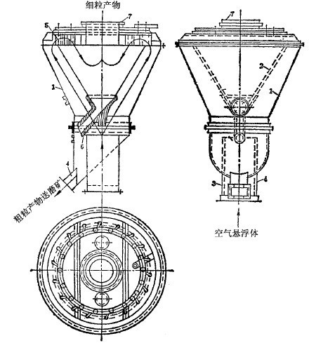 另一種結構近于水力旋流器的風力旋流器,為提高分級效率,下部還供入上升氣流。通過式離心分級器(見圖3-4-8),主要用于與干式磨機閉路工作。設備主要由外錐1和內錐2組成,上部裝有導向葉片5,使由內外錐之間上來的氣流呈切線進入內錐。磨機產物與氣流一起從底部管道中以大約18-20米/秒的速度向上供入,進入內外錐之間的環形空間后,因過流斷面變大,速度降到4-6米/秒,于是,粗的礦粒落下,由管4中排出,返回磨機再磨。其他礦粒被氣流帶著往上行,經葉片5,呈切線進入內錐,產生回旋運動。在慣性離心力作用下,較粗的礦粒被拋到內錐壁上,然后下落,由排礦管6排出。這種產物或作為產品,或者返回磨機,視情況而定。細礦粒隨氣流從頂部管道中排出,集塵器中收集,為細粒產物。