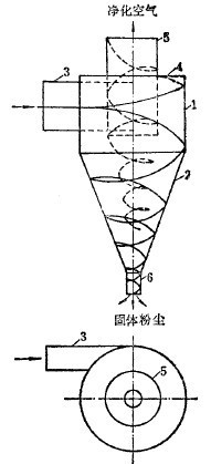 200 目占97%的產物時,處理量為0.85-32噸/時。葉輪式風力分級機的結構緊湊,不需再加風機和集塵器,生產率也較大。旋風集塵器是一種應用很廣的集塵設備,和布袋收塵、電收塵等同屬集塵類設備。但旋風集塵器除用作收塵之外,它也可用于除塵(相當水力分級的脫泥)和分級。因此,有人把它稱為旋風分級器,也有人叫它風力旋流器。旋風集塵器的結構如圖3-4-10 所示,它的結構和分級原理與水力旋流器基本相同。只是其直徑要大些,介質是空氣。